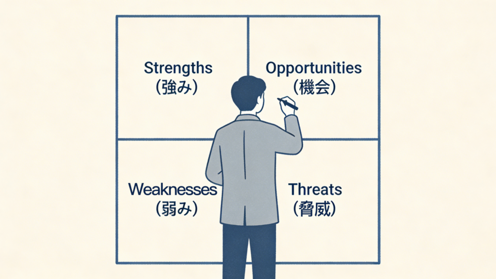 もう一つの有効な手法が「SWOT分析」です。経営戦略でも用いられるこの分析方法を、個人のキャリアプランに応用してみましょう。自分の「強み」「弱み」「機会」「脅威」を整理することで、転職すべきか今の会社で異動すべきかなど、具体的なアクションが見えてきます。