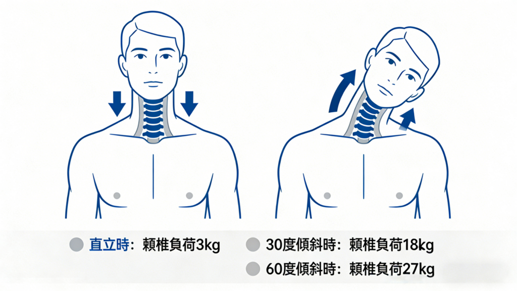 成人の頭の重さは約5kg。首が30度前に傾くだけで、首への負荷は約18kgに達します。さらに60度では、約27kgもの重みがかかるというデータもあります。