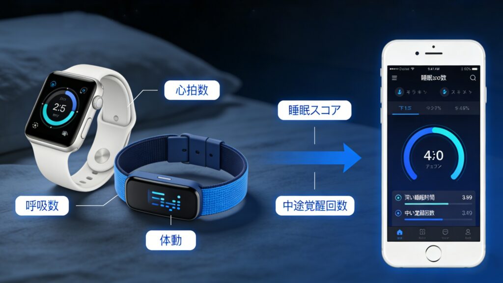 指輪型や腕時計型のデバイスが、心拍数、血中酸素濃度、体表面温度、寝返りの回数などを高精度で計測。「深い睡眠(ノンレム睡眠)」と「浅い睡眠(レム睡眠)」のバランスをアプリでスコア毎朝スコア化し、睡眠の質を客観的に把握できるようになった。